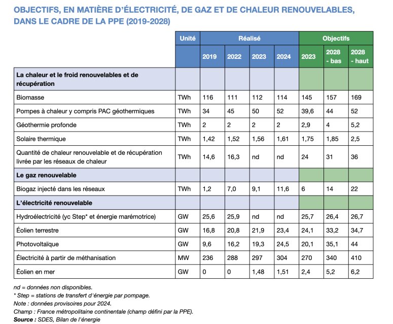 - En 2024, l’hydroélectricité et les pompes à chaleur (PAC) ont atteint leur objectif bas de production ou de puissance et seules les PAC ont atteint leur objectif haut (avec 100 % de l’objectif atteint en 2024).