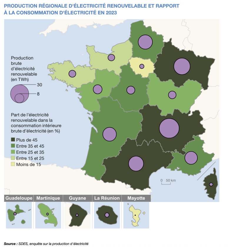 - 93 % est issue des EnR électriques (hydraulique renouvelable, éolien, solaire PV et énergie marémotrice).